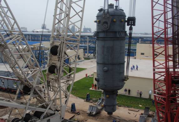 公司華錦項目部承建的遼寧北方化學(xué)工業(yè)有限公司20萬噸/年環(huán)氧乙烷/乙二醇裝置工程(簡稱EO/EG裝置)關(guān)鍵進口設(shè)備泰國(larsen and Toubro Limited)制造的第一臺反應(yīng)器R-110,于2009年7月30日12:18分成功吊裝就位;第二臺R-120,于2009年8月5日11:18 成功吊裝就位。反應(yīng)器(R-110/120)是EO/EG裝置的核心設(shè)備,且為特大型的列管式固定床反應(yīng)器,該設(shè)備單臺凈重482噸,吊裝重量558.8噸。安裝時,需起吊指設(shè)備底部高度必須超過20米后,再從鋼筋混凝土框架向下插入,安裝在19.460米鋼筋混凝土框架梁上。